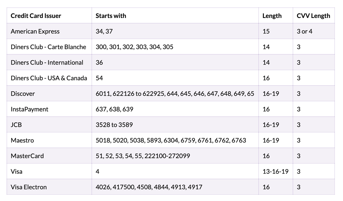 This being said, the only unique identifier is the first digit(s) of the card. Below, you can see the corresponding digit for the most commonly used card brands: