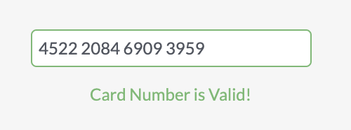 To bring your card number validation to the next level, you can include Luhn’s Algorithm. It’s widely used for validation of a variety of identification numbers including credit card numbers. It’s a checksum formula, containing a few simple steps. Let’s take a look at an example: