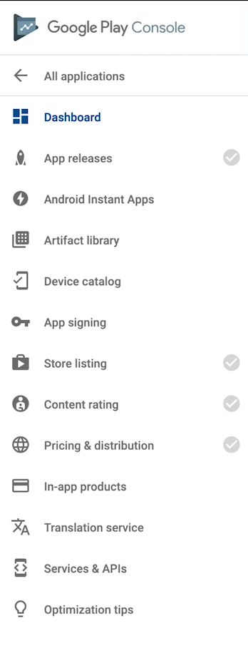 Once you’ve created the app, you need to go to your google play console and fill in all the required details. Once you fill in the details on a category, the grey checkmarks on the left panel should become green. Please note that since we don’t have an APK file just yet, you won’t be able to fill in the app releases section — we’ll generate an APK in the next steps.