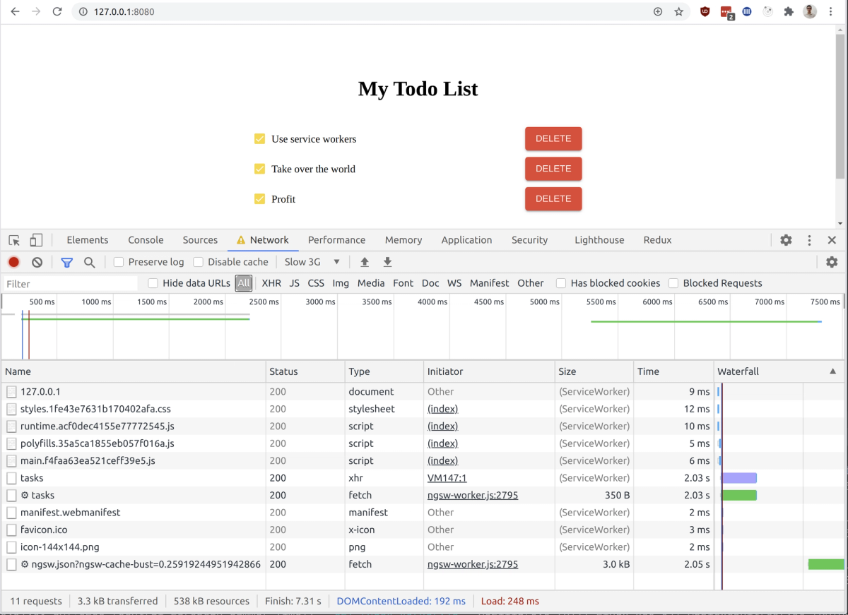 If you hit refresh, you can also see that your app should load much faster but the todo app is small in itself, so you can fix this by slowing down your connection speed manually with the chrome dev tools: