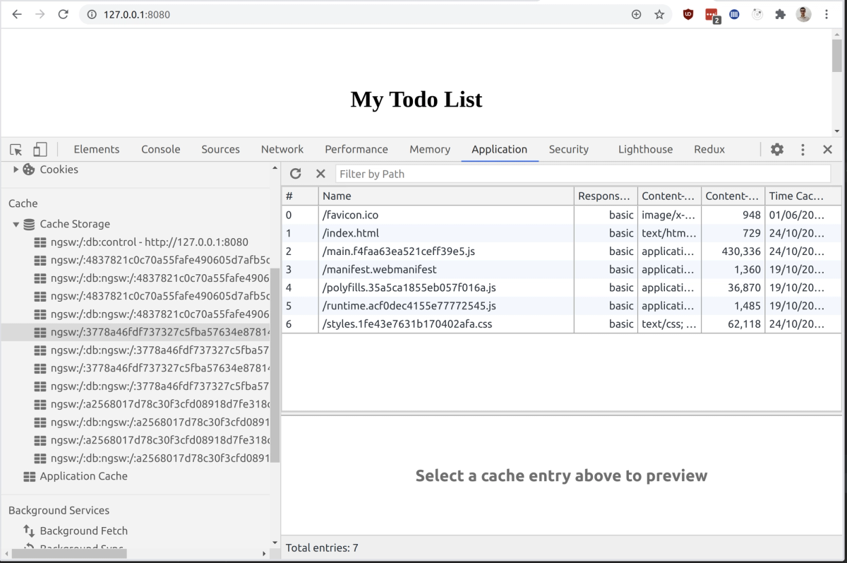 Files cached by the service worker can be viewed in the “cache storage” section. As can be seen in the screenshot below, the main and the index files are being stored in this specific cache. The files stored here depend largely on the contents in your ngsw-config file. You can read more about configuring it in the official docs .