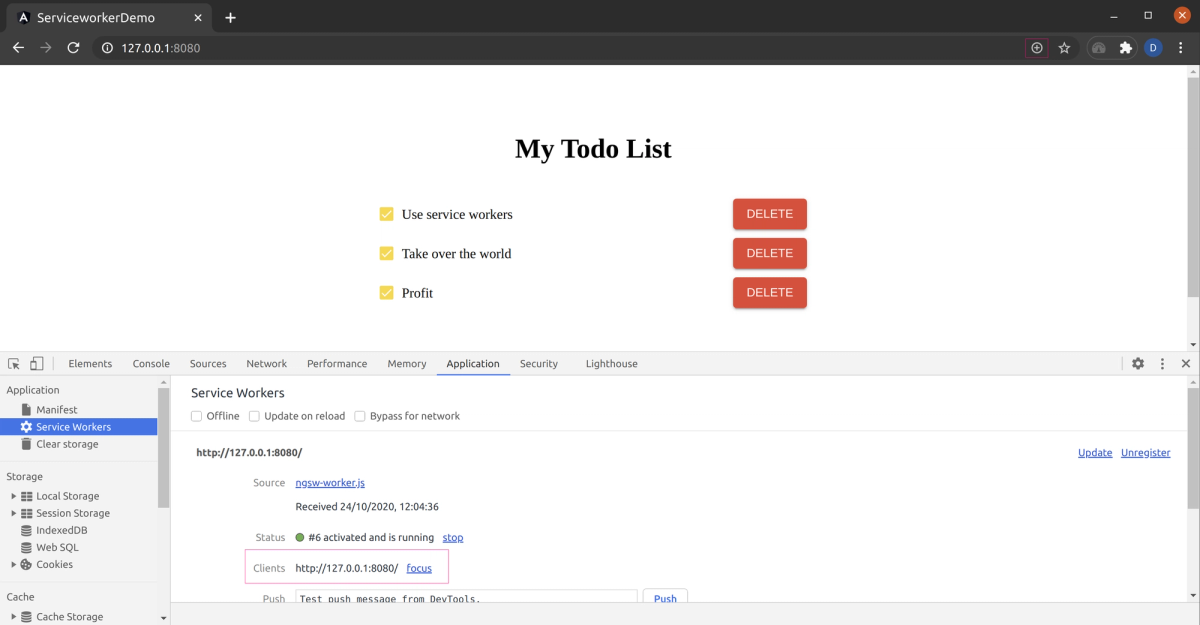 If everything is working as expected, you should be able to see the service worker in the development tools, and your app should have an installation prompt (the small plus icon on the right of the URL bar in the case of chrome)