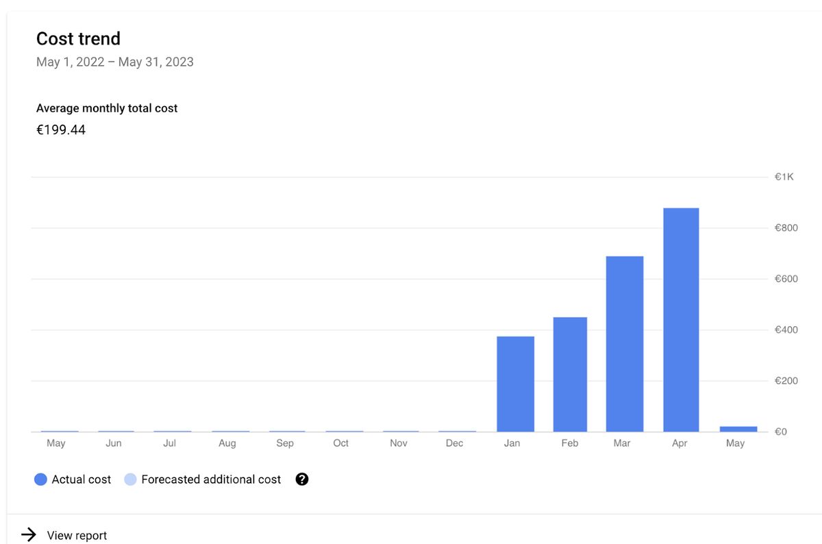 This is the cost chart from SoloTrvlr’s development phase. Starting from nearly negligible costs, our Google Maps API fees took a dramatic upward turn in January, and by April, they had skyrocketed to nearly €1,000 for a single month (in Google’s defence, they did forgive these costs as a one-time courtesy, which was certainly appreciated).