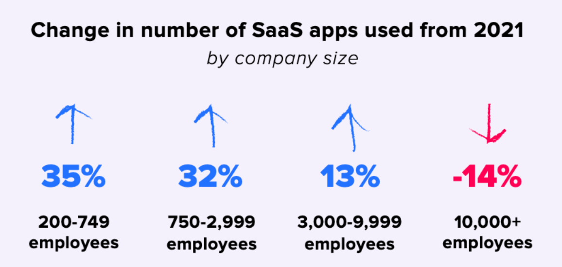 Large enterprises used the most SaaS products this year at 410, however, medium-sized companies adopted new apps at a faster rate than any other group.