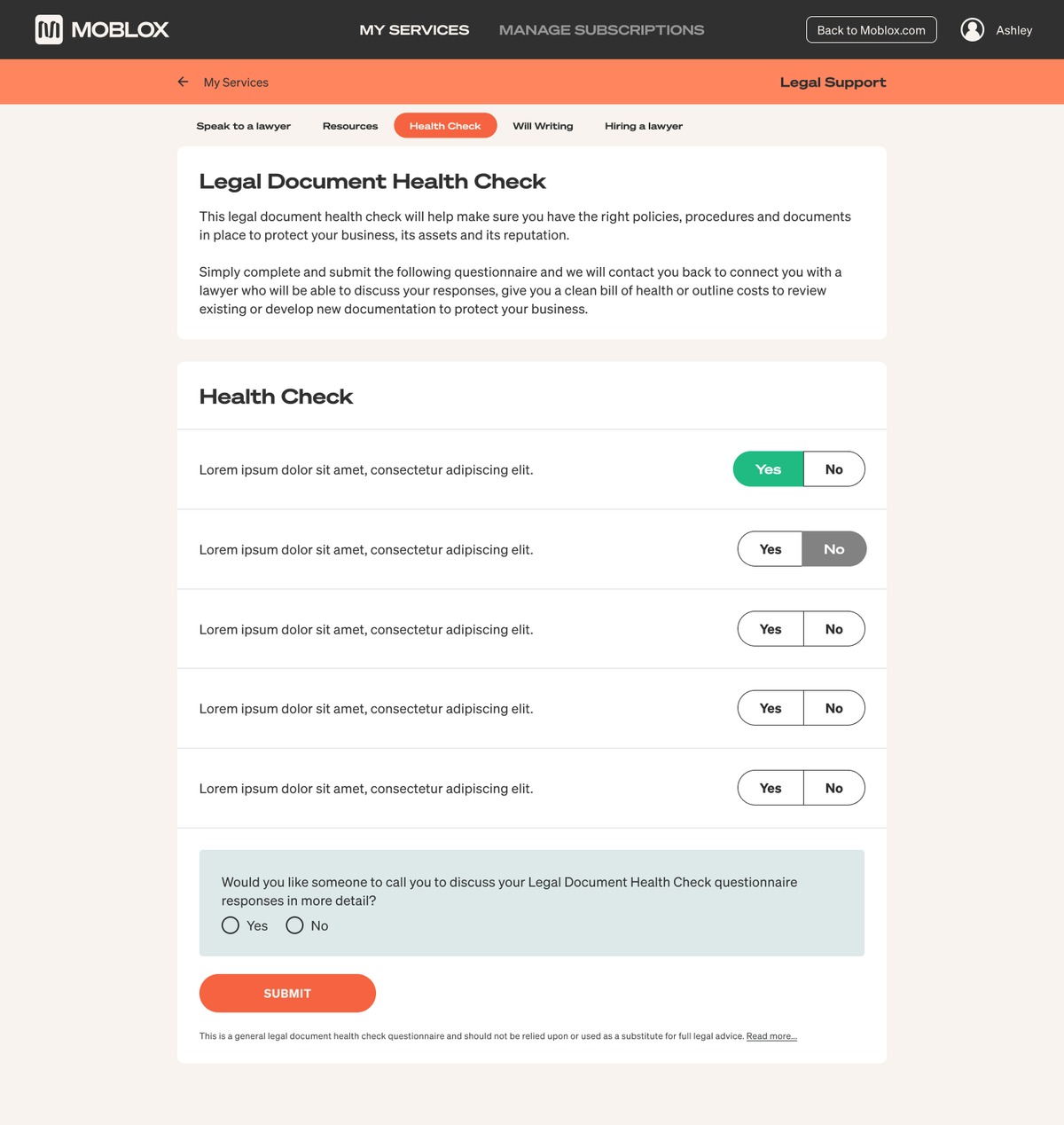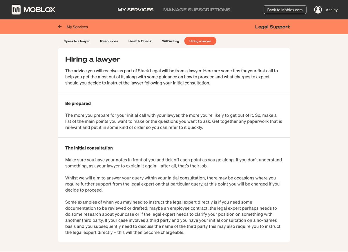 Another feature of the Moblox platform is a legal health check and support helpline, which highlights legal issues and documentation to be submitted to UK authorities. Sanity served as the backbone for managing the content and logic behind this workflow: