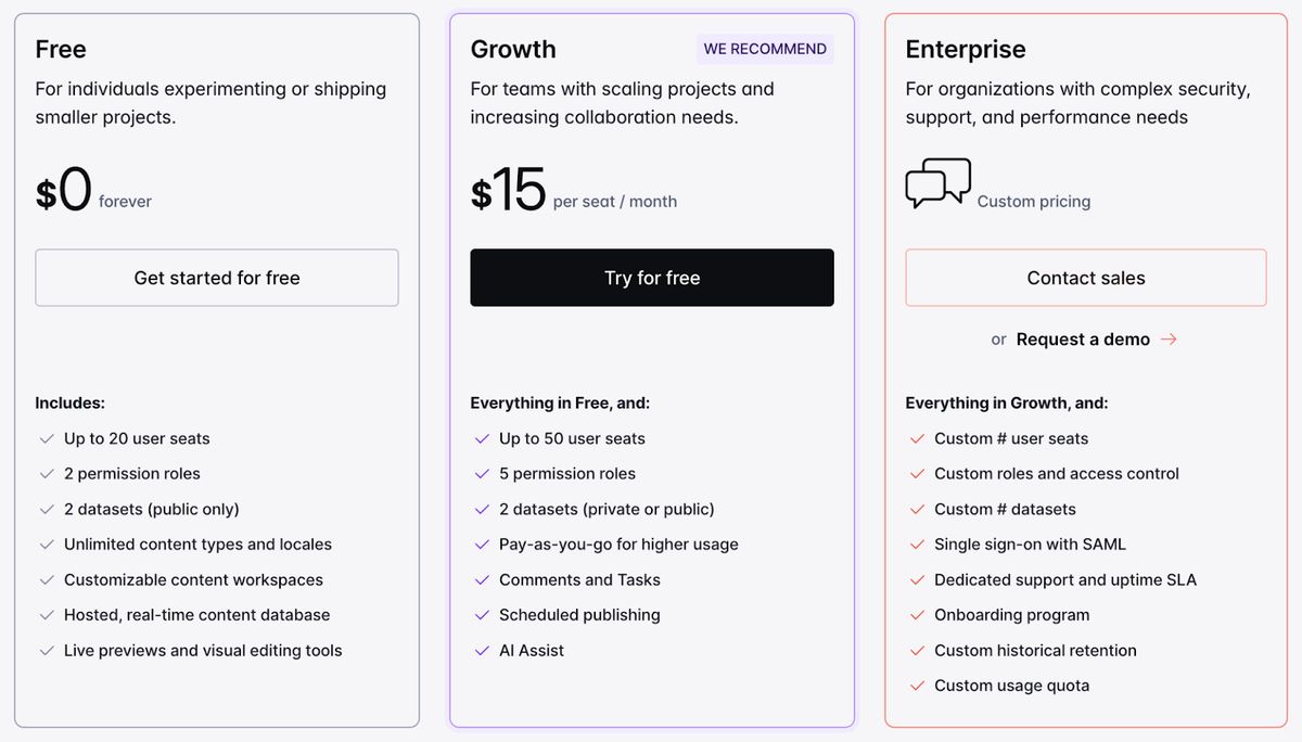 Sanity has a free-tier plan that’s pretty generous and it’s great for smaller-scale projects or individuals who are looking to try out the platform. The paid plans are on a pay-as-you-go basis (starting from $15 per seat per month) which makes scaling and managing expenses easier. For bigger enterprises with more advanced needs, Sanity offers custom pricing options.