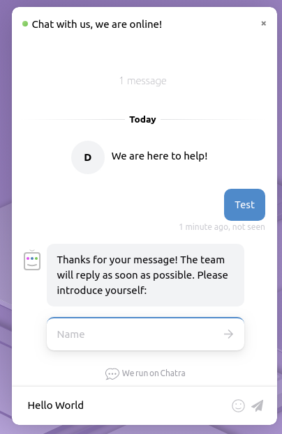 - Reduced time to interactive — By default, a notification happens when the conversation is handed off to you. There is no notification while a new user is typing their message (no time to prepare). What’s more, when no one is online, by default the chat does nothing to indicate that no one is available to take the message