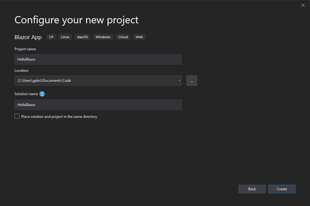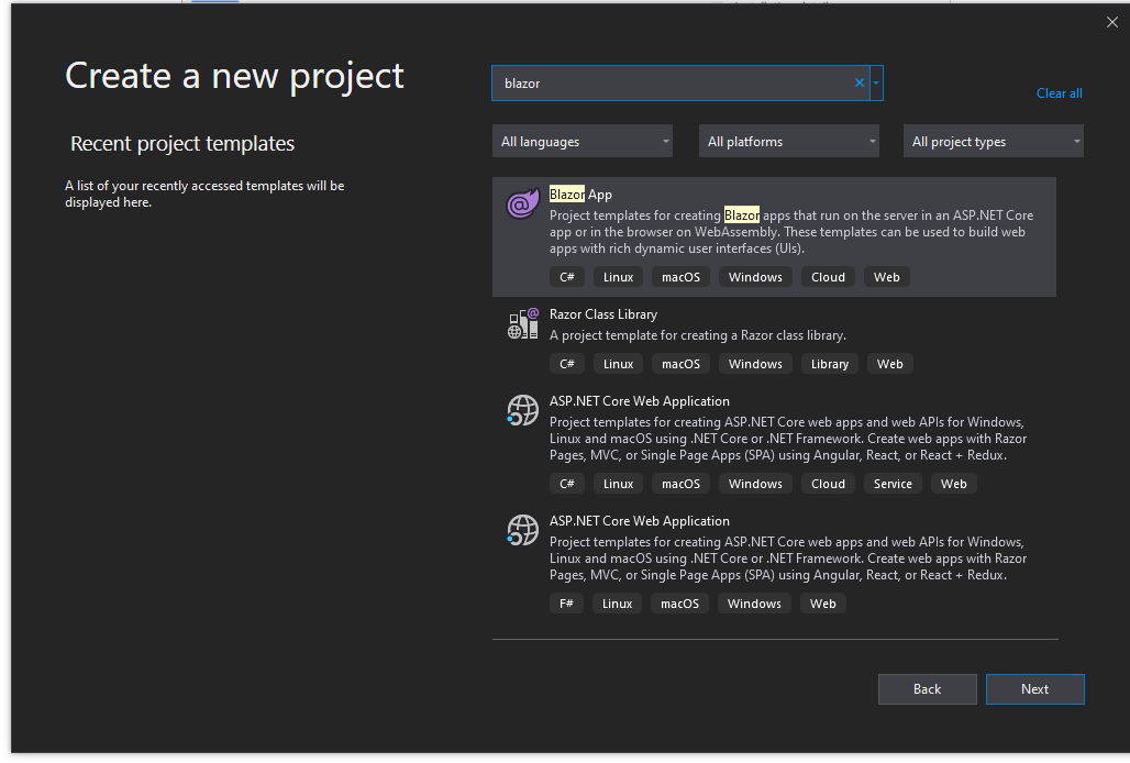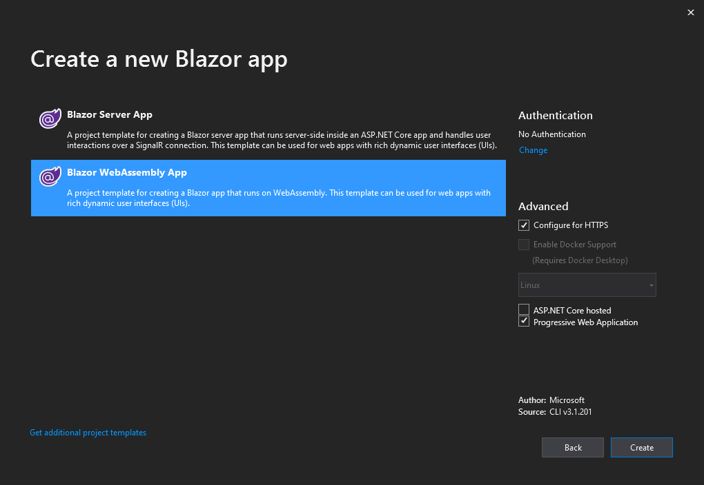 - Select “blazor web assembly app” and be sure to check the Progressive Web Application option (more on this in a bit)