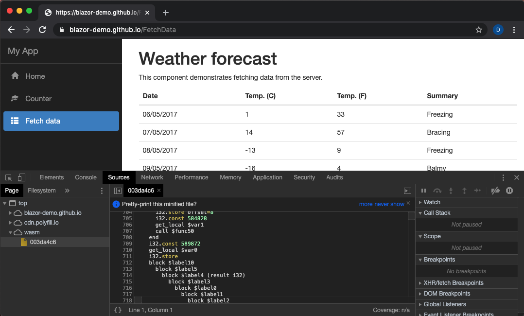 - Security by obfuscation — .wasm files only contain processor instructions and because of this it is very hard to view/modify the original source code. Head over to the live blazor demo and have a look at the source files