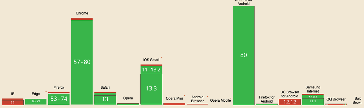 As of April 2020, 90% of browsers used today are supported (source: caniuse.com ). The notable outliers are IE, opera mini and UC browser.