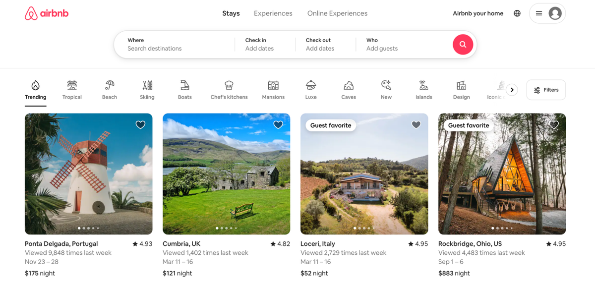 - Visual storytelling: Through high-quality images and a clean layout, each listing tells a story, making users feel like they're already on their vacation. This emotional engagement is key to Airbnb's design success.